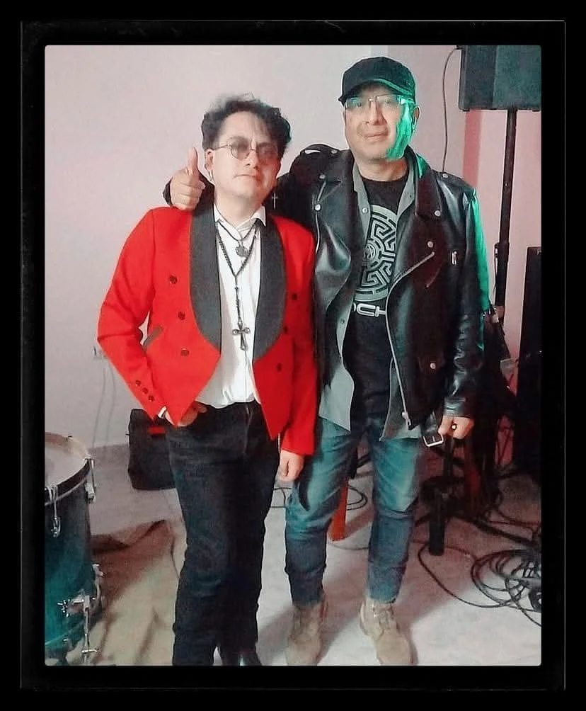 Un leal seguidor aprovecha una fotografía con Koki Flores (derecha) durante el tributo a Los Violadores en Huancayo.
