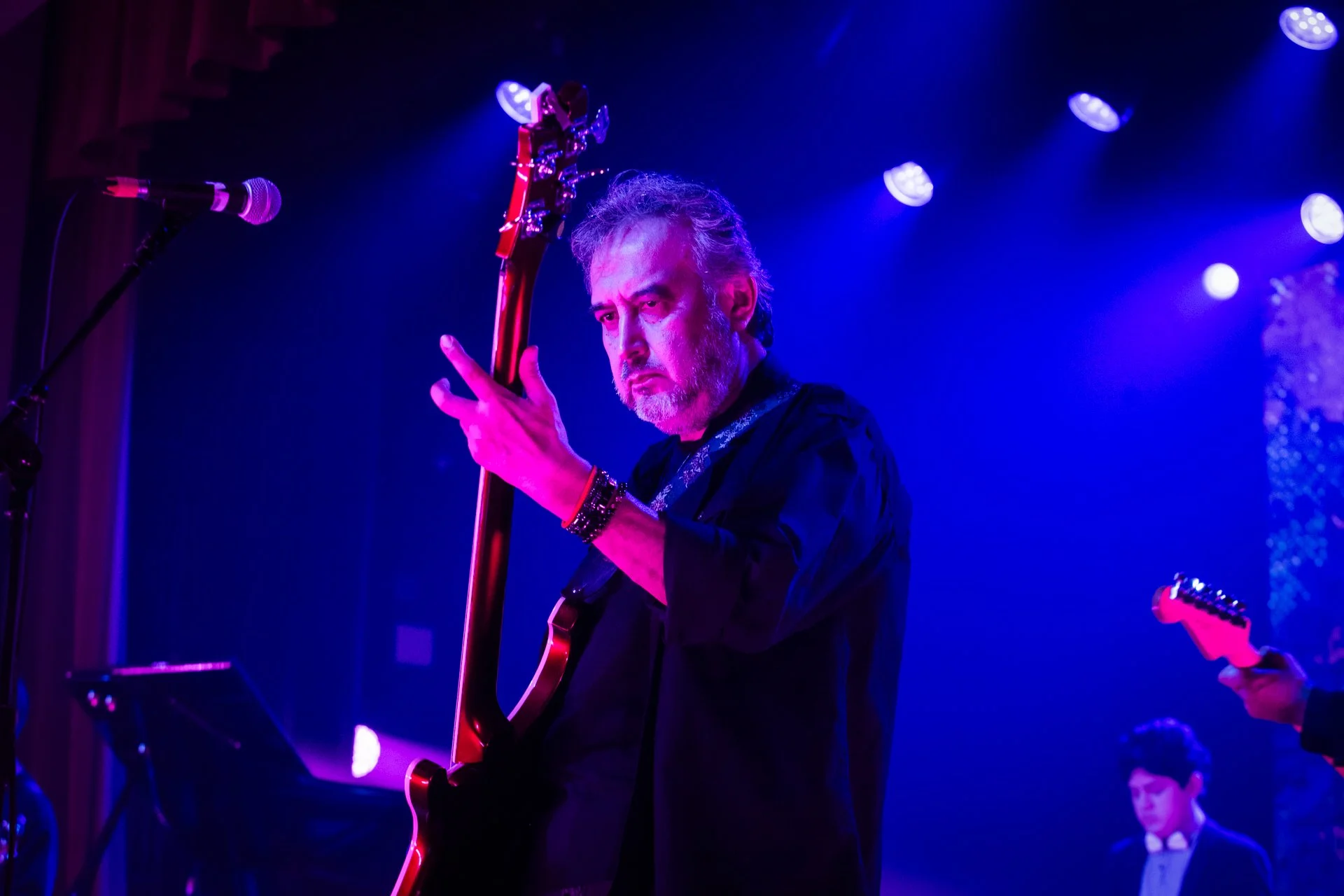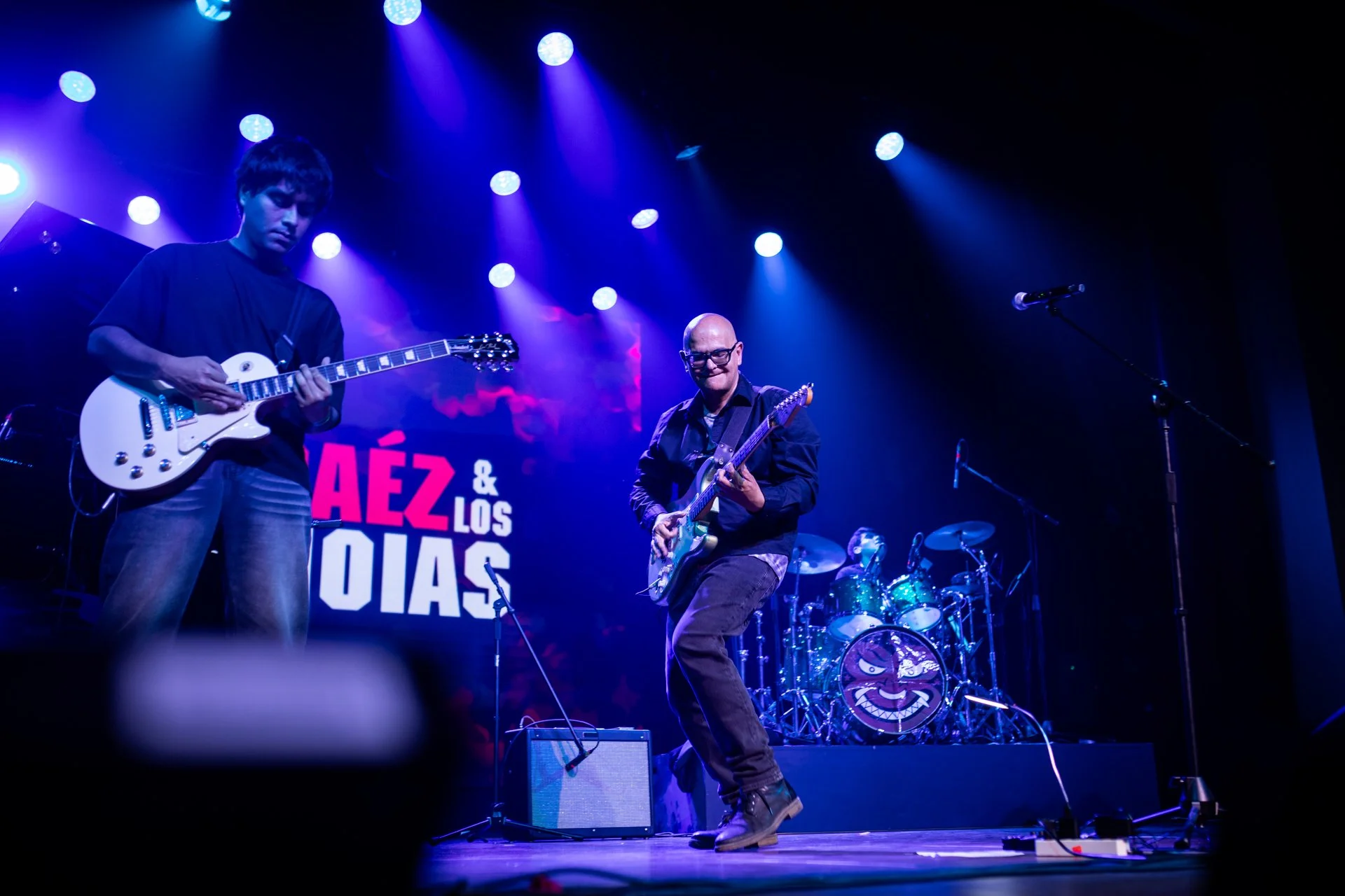 Rafo Raez es uno de los más versátiles músicos peruanos, lo que le ha servido para incluir sus composiciones en proyectos de diversas expresiones artísticas, cuando no ha creado directamente para un proyecto específico, de lo cual hay discos, registros atemporales. Como solista y, cómo no, con Rafo Raez & Los Paranoias ha sentado y ha hecho respetar su posición sobre el escenario y fuera de éste. Así las cosas, la celebración sabatina no fue una excepción, el cartel para mí fue sorpresivo, dos bandas punks (Héroe Inocente y Morbo), Dafne Castañeda, una solista electrónica experimental, y Luis Carlos Burneo, el popular Henry Spencer, precursor youtuber en nuestro medio, como “animador”. También el horario, podríamos considerarlo inusual o simplemente determinado por las dinámicas de un teatro, donde, a diferencia de un pub, todo acaba antes de medianoche. Dado que, digamos, no estoy acostumbrado a horarios teatrales… ¡llegué tarde! Me perdí a Morbo y a Héroe Inocente. Mi partner, el fotógrafo Renato Pajuelo, llegó cuando H.I. tocaba su última canción y nos dejó el momento registrado.